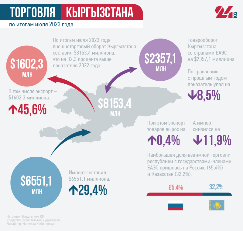 По итогам июля 2023 года внешнеторговый оборот Кыргызстана составил $8 миллиардов 153,4 миллиона, что на 32,3 процента выше показателя 2022-го. Экспорт — $1 миллиард 602,3 миллиона (рост на 45,6 процента), импорт — $6 миллиардов 551,1 миллиона (рост на 29,4 процента).