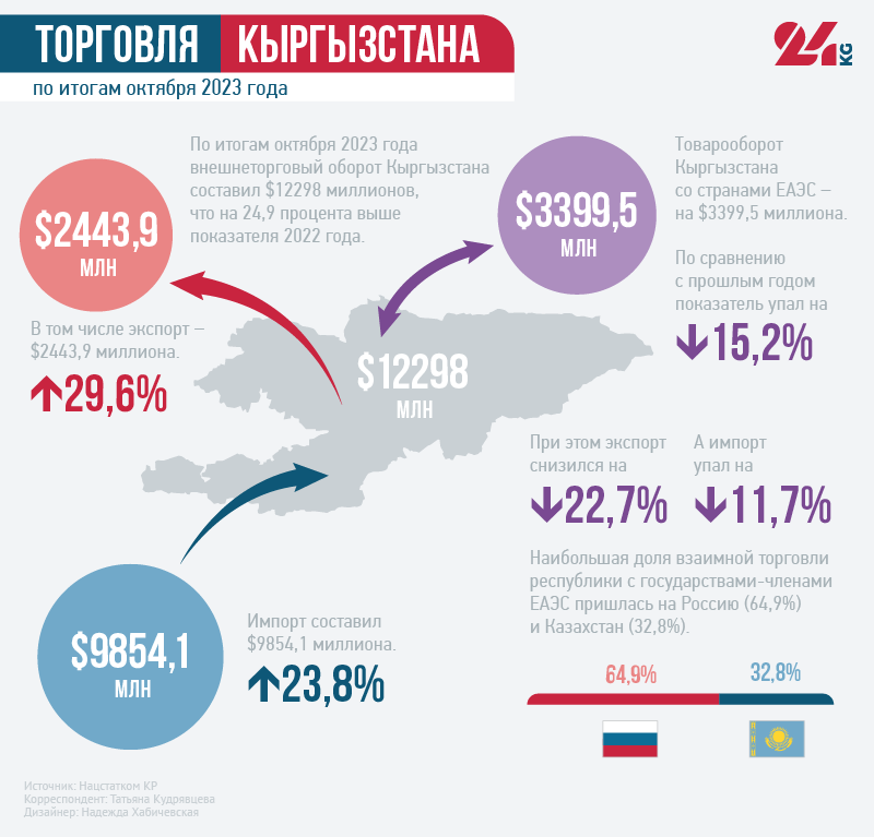 По итогам октября 2023 года внешнеторговый оборот Кыргызстана достиг $12 миллиардов 298 миллионов, что на 24,9 процента выше показателя 2022-го. Экспорт — $2 миллиарда 443,9 миллиона (рост на 29,6 процента), импорт — $9 миллиардов 854,1 миллиона (рост на 23,8 процента).