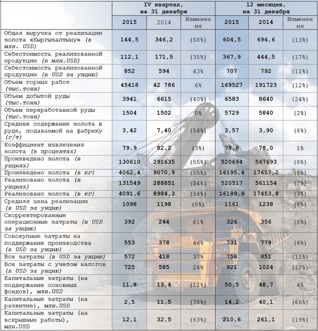 Компания «Кумтор Голд Компани» подвела основные итоги производственной деятельности в 2015 году. Об этом сообщает отдел по связям со СМИ КГК.