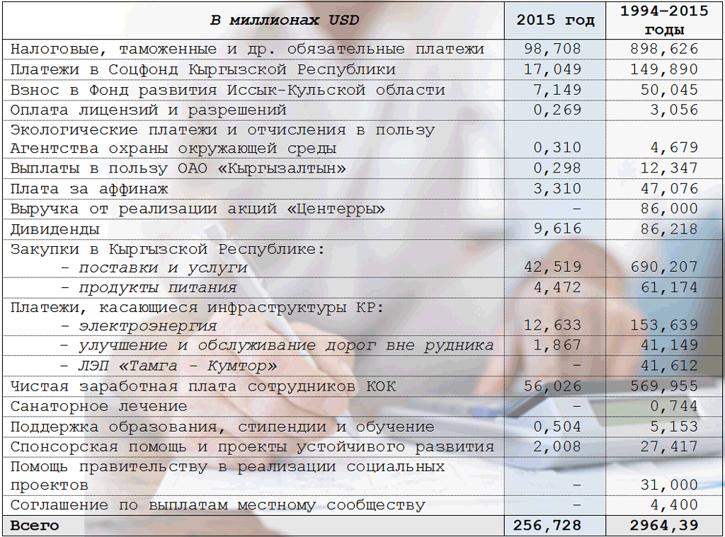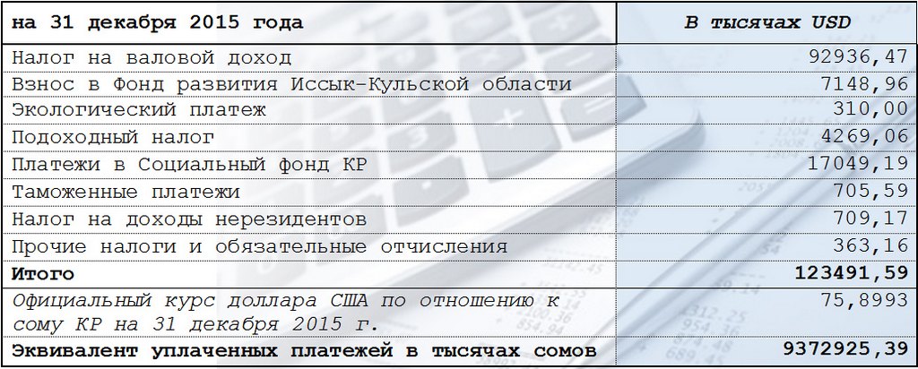 За двенадцать месяцев 2015 года платежи в бюджет КР в виде налогов, отчислений в Социальный фонд КР, а также прочие обязательные выплаты со стороны компании превысили $123 миллиона, что по курсу Национального банка КР на 31 декабря 2015 года составило около 9 миллиардов 373 миллионов сомов.