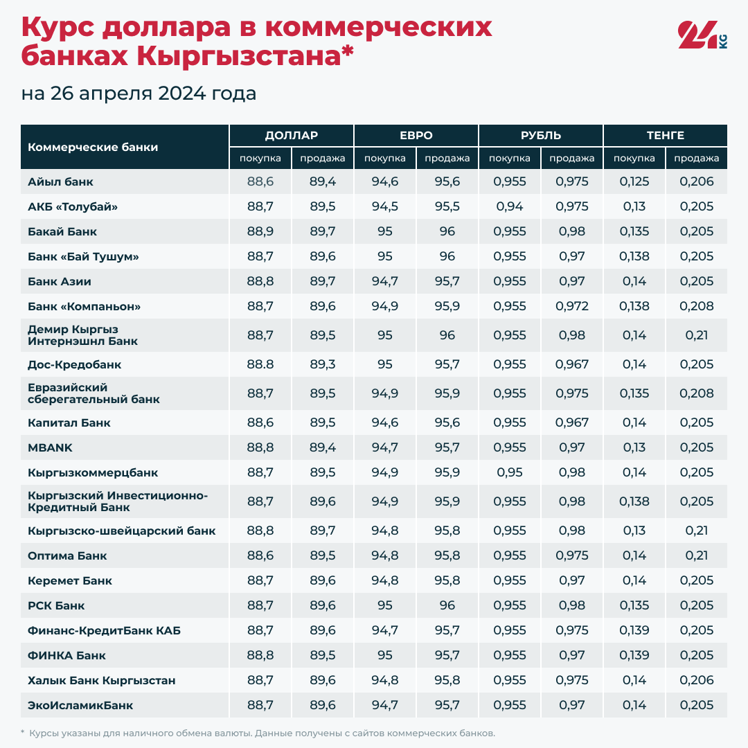 Курс доллара в коммерческих банках Кыргызстана на 26 апреля