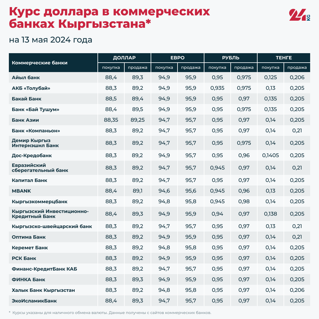 Курс доллара в коммерческих банках Кыргызстана на 13 мая