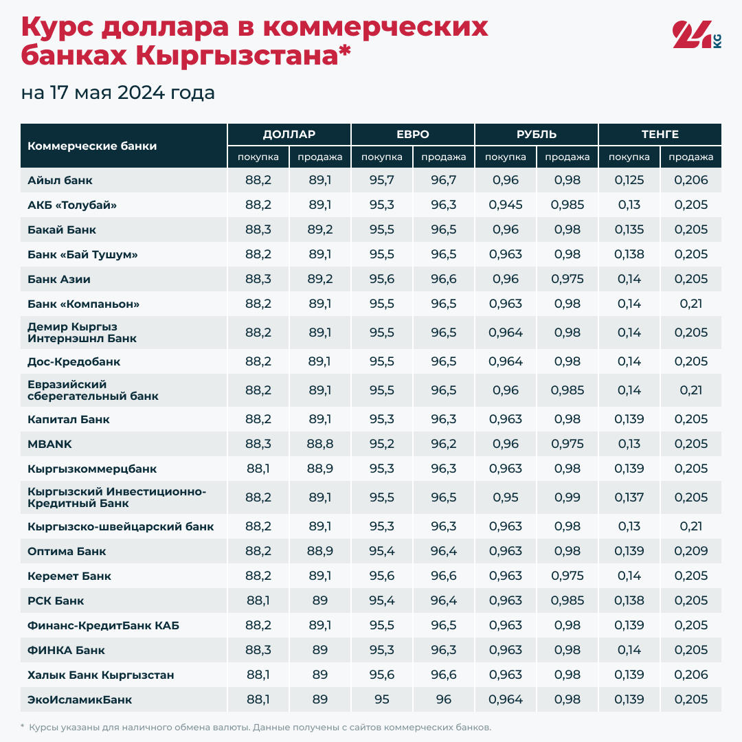 Курс доллара в коммерческих банках Кыргызстана на 17 мая