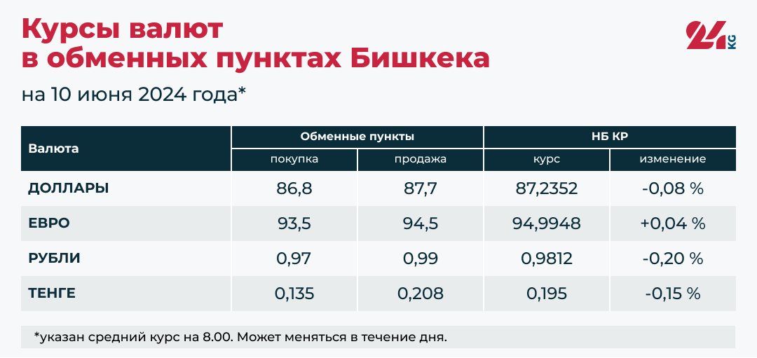 За последние сутки курсы российского рубля, доллара и тенге снизились по отношению к сому. Евро немного подрос. Об этом свидетельствуют данные и обменных пунктов, и Национального банка Кыргызстана.