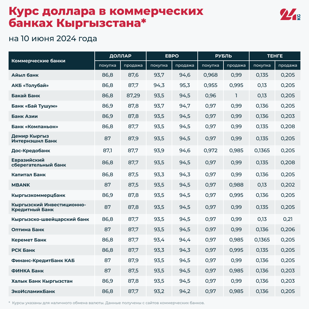 Курс доллара в коммерческих банках Кыргызстана на 10 июня
