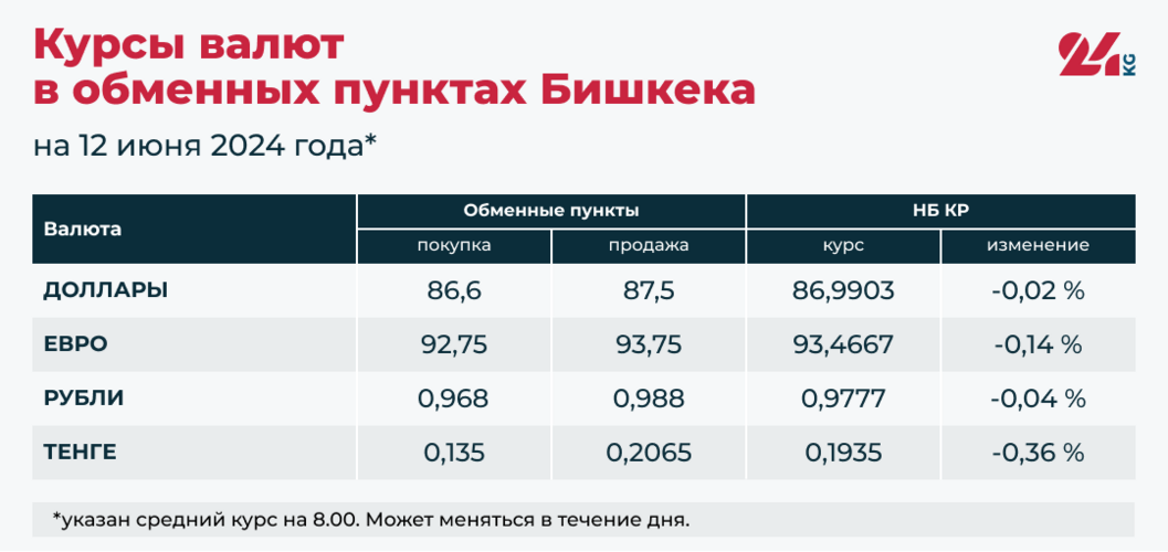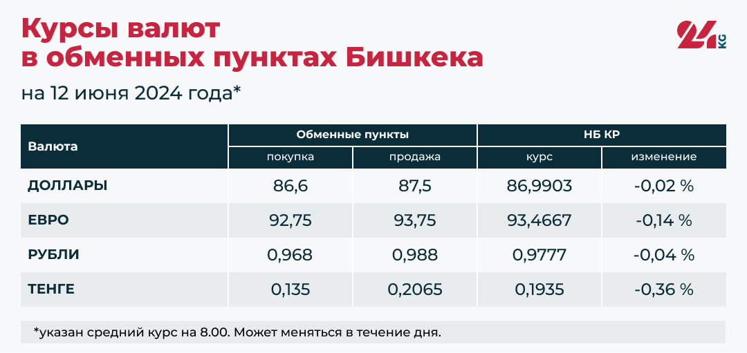 Сегодня с утра обменные пункты в Бишкеке покупают, в среднем, доллар по 86,6 сома, продают — по 87,5 сома. Номинальный курс Национального банка — 86,9903 сома (снижение на 0,02 процента).