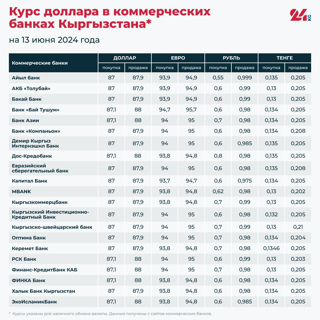 Курс доллара в коммерческих банках Кыргызстана на 13 июня