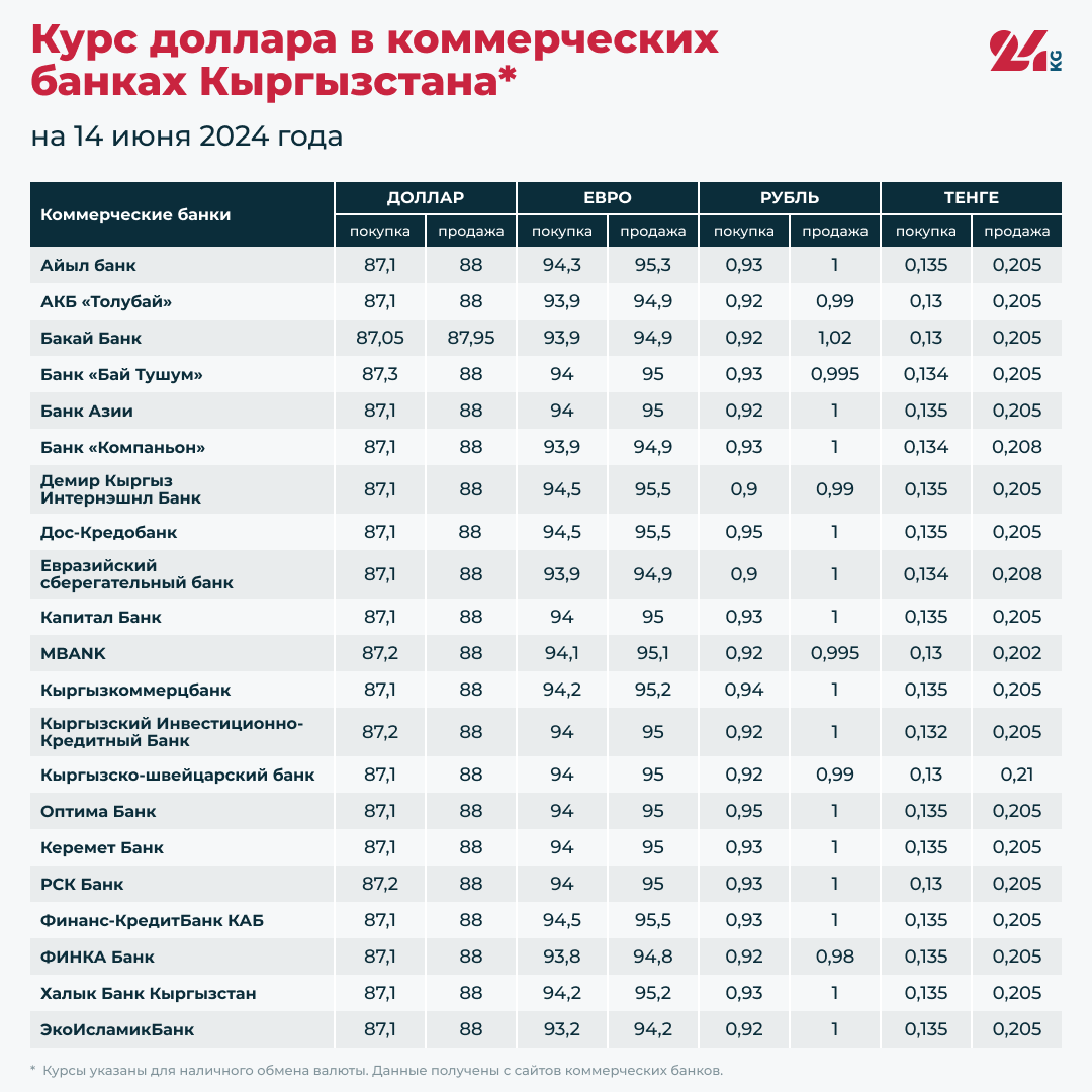Курс доллара в коммерческих банках Кыргызстана на 14 июня