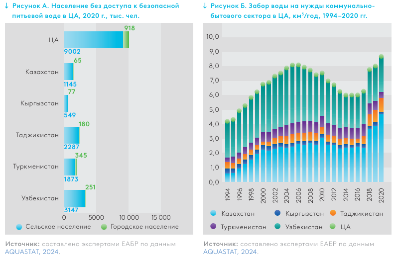 На сегодня в Центральной Азии 9,9 миллиона человек, или 13 процентов населения региона, не имеют доступа к безопасной питьевой воде. За 1994-2020 годы объем забора воды на коммунально-бытовые нужды вырос в два раза, а инвестиции в инфраструктуру питьевого водоснабжения были неадекватны росту потребления.