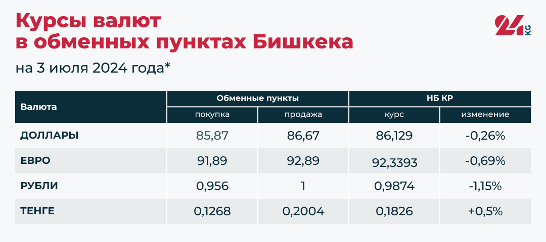 Сегодня с утра обменные пункты в Бишкеке покупают в среднем доллар по 85,87 сома, продают по 86,67 сома. Номинальный курс Нацбанка — 86,129 сома (снижение на 0,26 процента).