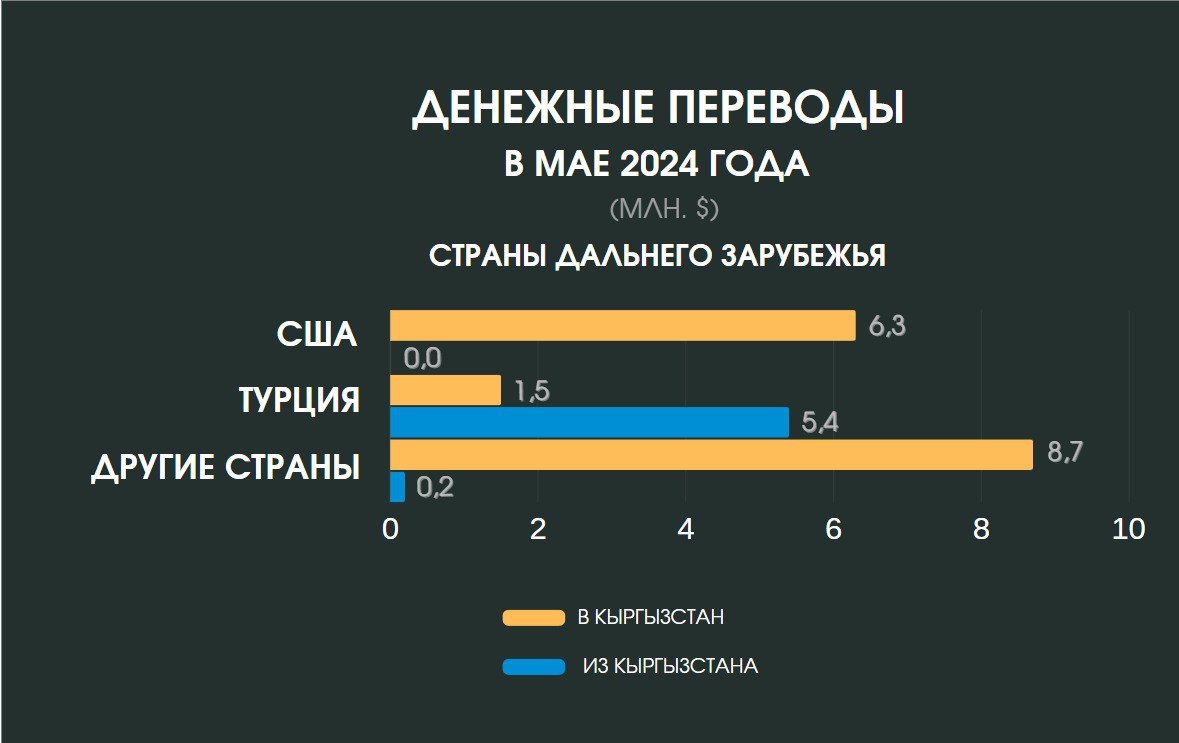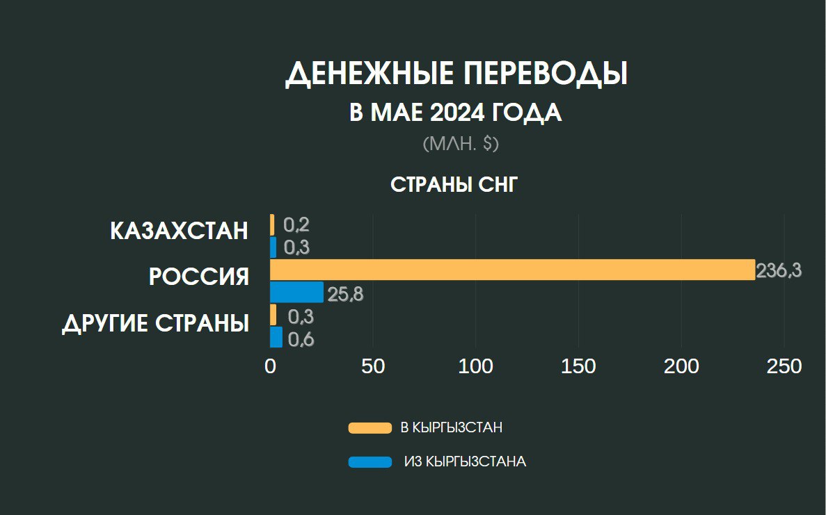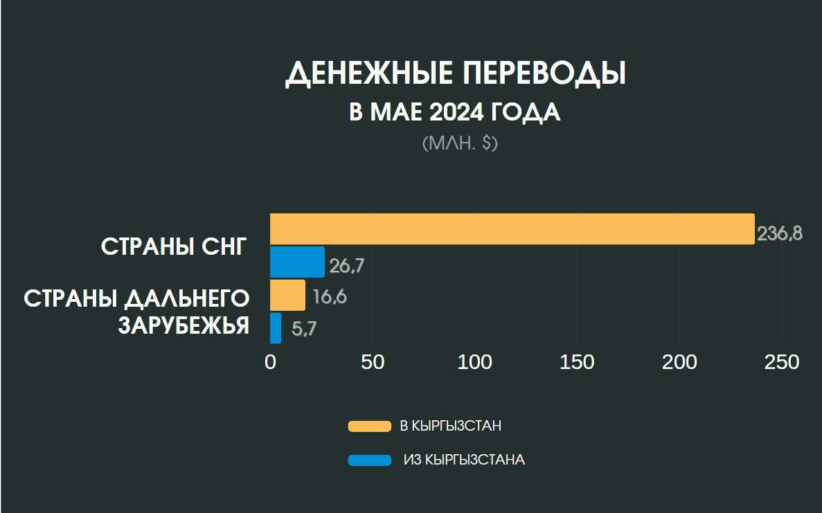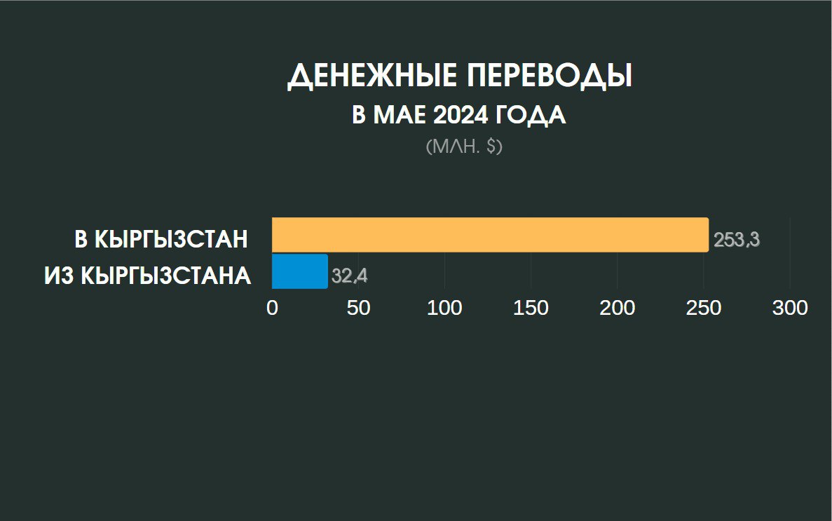 В мае снизился отток денежных средств из страны и составил $32,4 миллиона, что на $2,5 миллиона меньше, чем в апреле. Основная часть денег была отправлена в страны СНГ — $26,7 миллиона (82,41 процента), а $5,7 миллиона (17,59 процента) — в страны дальнего зарубежья. За пять месяцев объем денежных переводов из Кыргызстана составил $205,6 миллиона.