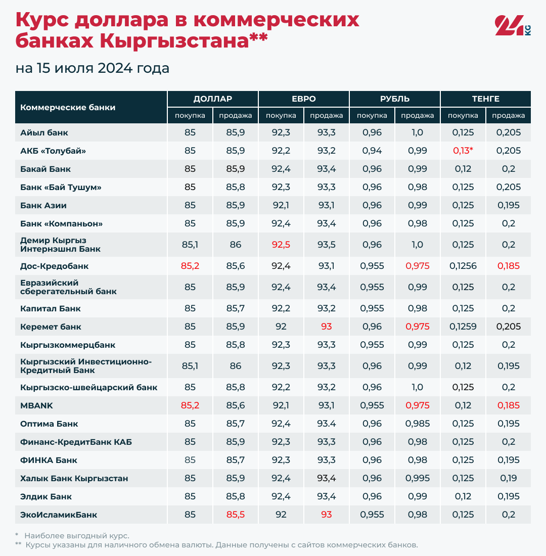 Курс доллара в коммерческих банках Кыргызстана на 15 июля