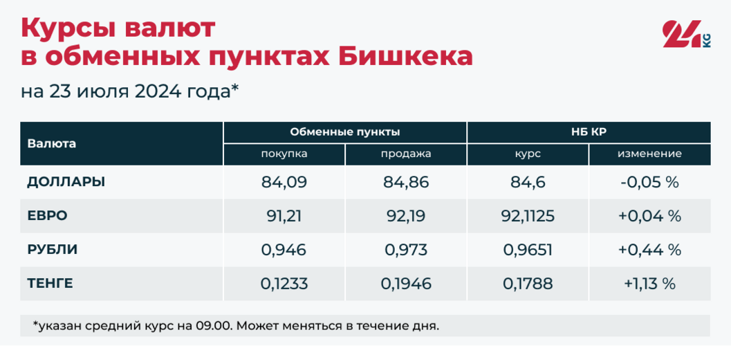 Сегодня с утра обменные пункты в Бишкеке покупают в среднем доллар по 84,09 сома, продают — по 84,86 сома. Номинальный курс Национального банка — 84,6 сома (снижение — 0,05 процента).