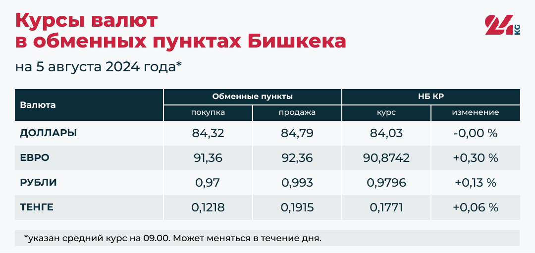 Сегодня с утра обменные пункты в Бишкеке покупают в среднем доллар по 84,32 сома, продают по 84,79 сома. Номинальный курс Нацбанка — 84,03 сома (без изменений за сутки).