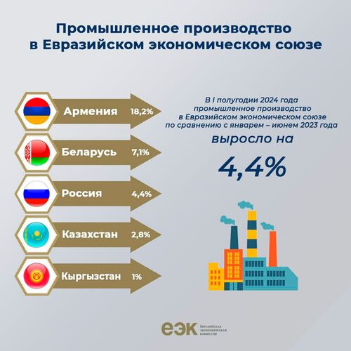 Рост промышленного производства наблюдался во всех государствах — членах союза: в Армении — на 18,2 процента, Кыргызстане — на 1% процент, Беларуси — на 7,1 процента, России — на 4,4 процента и Казахстане — на 2,8 процента.