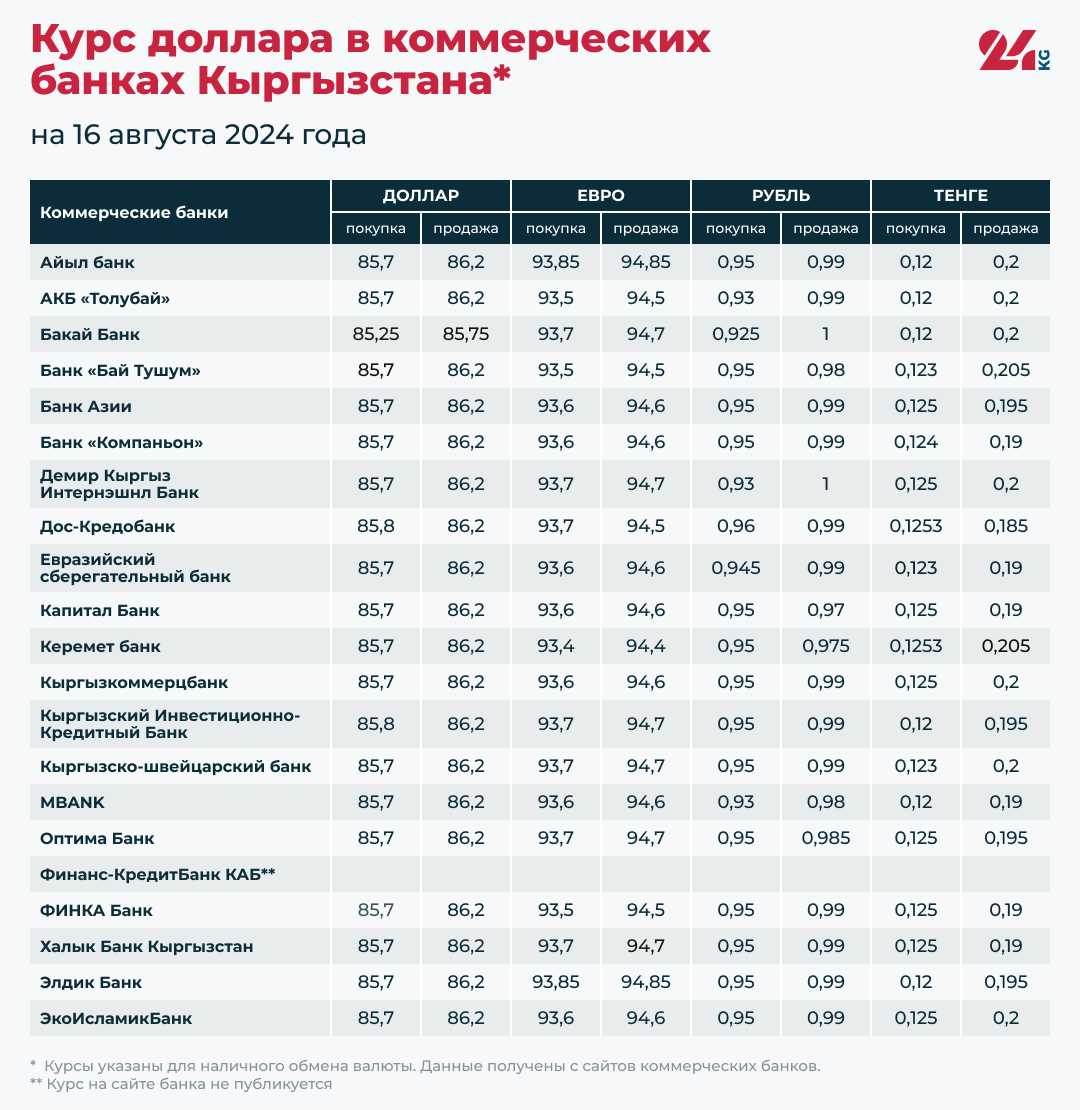 Курс доллара в коммерческих банках Кыргызстана на 16 августа