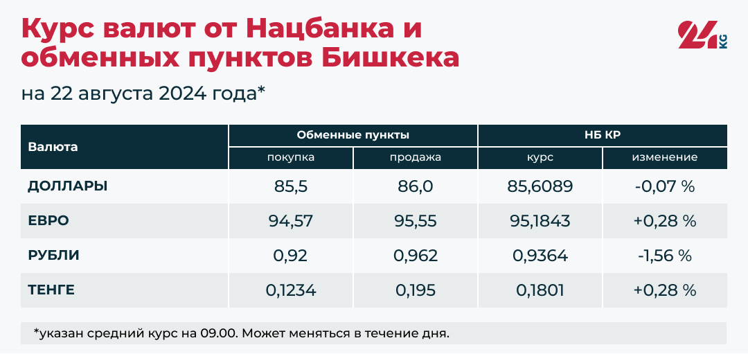 Сегодня с утра обменные пункты в Бишкеке покупают в среднем доллар по 85,5 сома, продают — по 86 сомов. Номинальный курс Национального банка — 85,6089 сома (снижение — 0,07 процента).