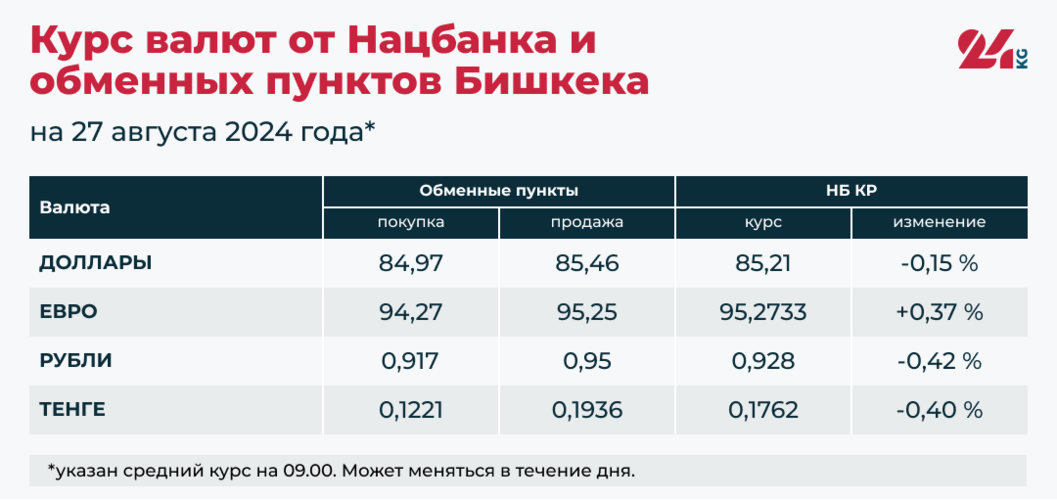 Сегодня с утра обменные пункты в Бишкеке покупают в среднем доллар по 84,97 сома, продают по 85,46 сома. Номинальный курс Нацбанка — 85,21 сома (снижение — 0,15 процента).