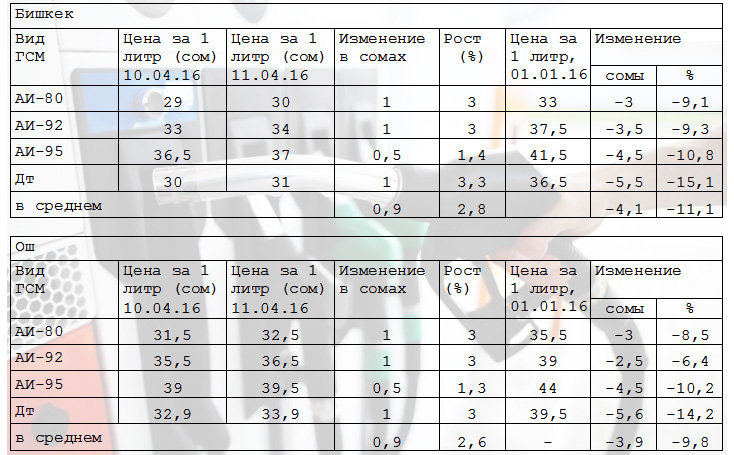 По ее данным, с 11 апреля по всем регионам республики на один сом повысилась стоимость бензина АИ-80, АИ-92 и дизельного топлива. Бензин марки АИ-95 подорожал на 0,5 сома. Это связано с повышением оптово-отпускных цен на российских НПЗ на 10-15 процентов.