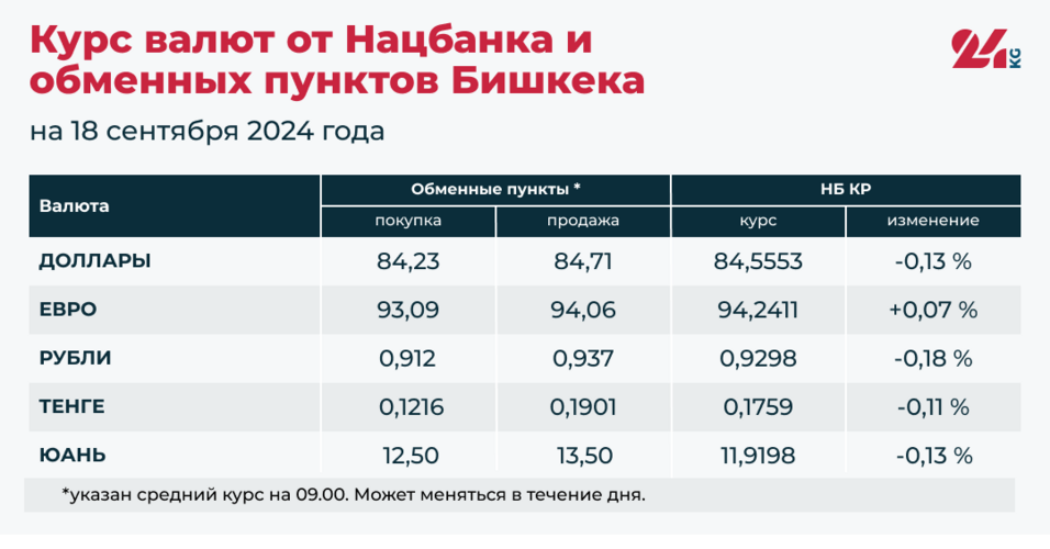 Сегодня с утра обменные пункты в Бишкеке покупают в среднем доллар по 84,23 сома, продают — по 84,71 сома. Номинальный курс Национального банка — 84,5553 сома (снижение — 0,13 процента).