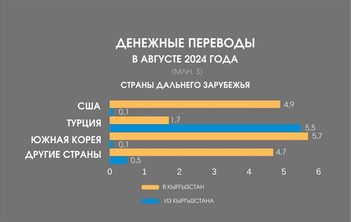 На конец августа объем денежных переводов из КР составил $36 миллионов. Из них $29,9 миллиона отправлено в страны СНГ, а $6,2 миллиона — в дальнее зарубежье.