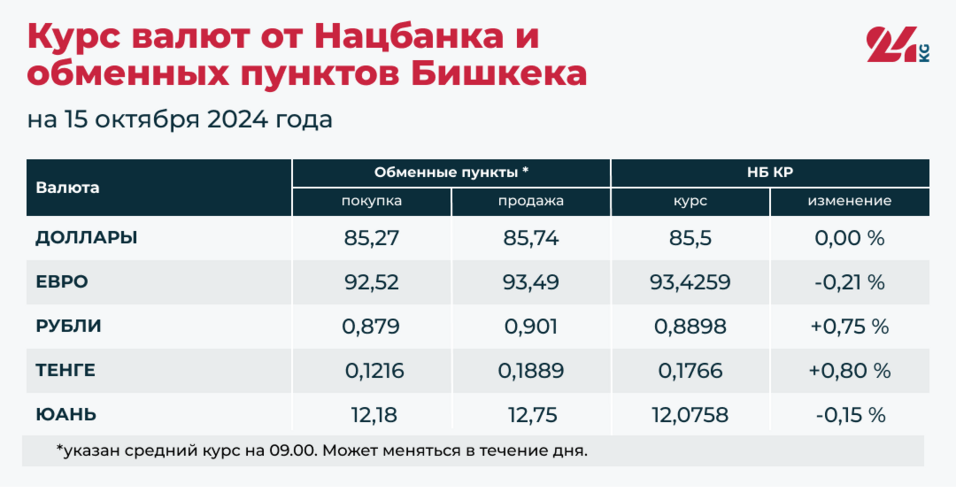 Сегодня с утра обменные пункты в Бишкеке покупают в среднем доллар по 85,27 сома, продают — по 85,74 сома. Номинальный курс Национального банка — 85,5 сома (без изменений).