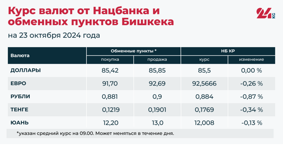 Сегодня с утра обменные пункты в Бишкеке покупают в среднем доллар по 85,42 сома, продают — по 85,85 сома. Номинальный курс Национального банка — 85,5 сома (без изменений).