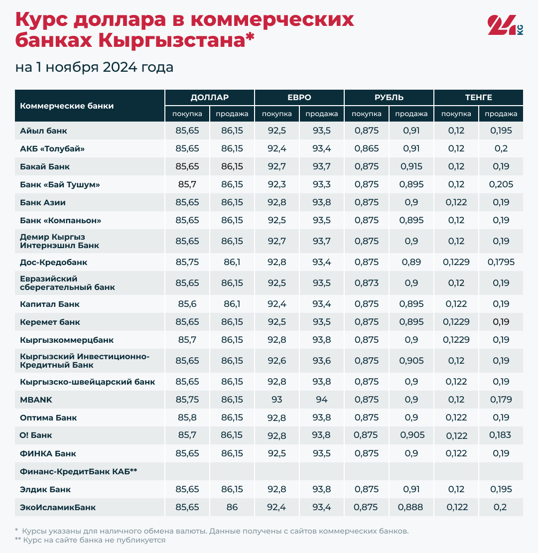 Курс доллара в коммерческих банках Кыргызстана на 1 ноября