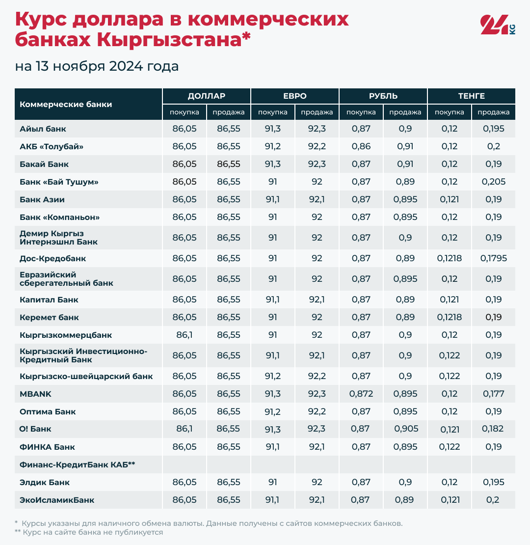 Курс доллара в коммерческих банках Кыргызстана на 13 ноября