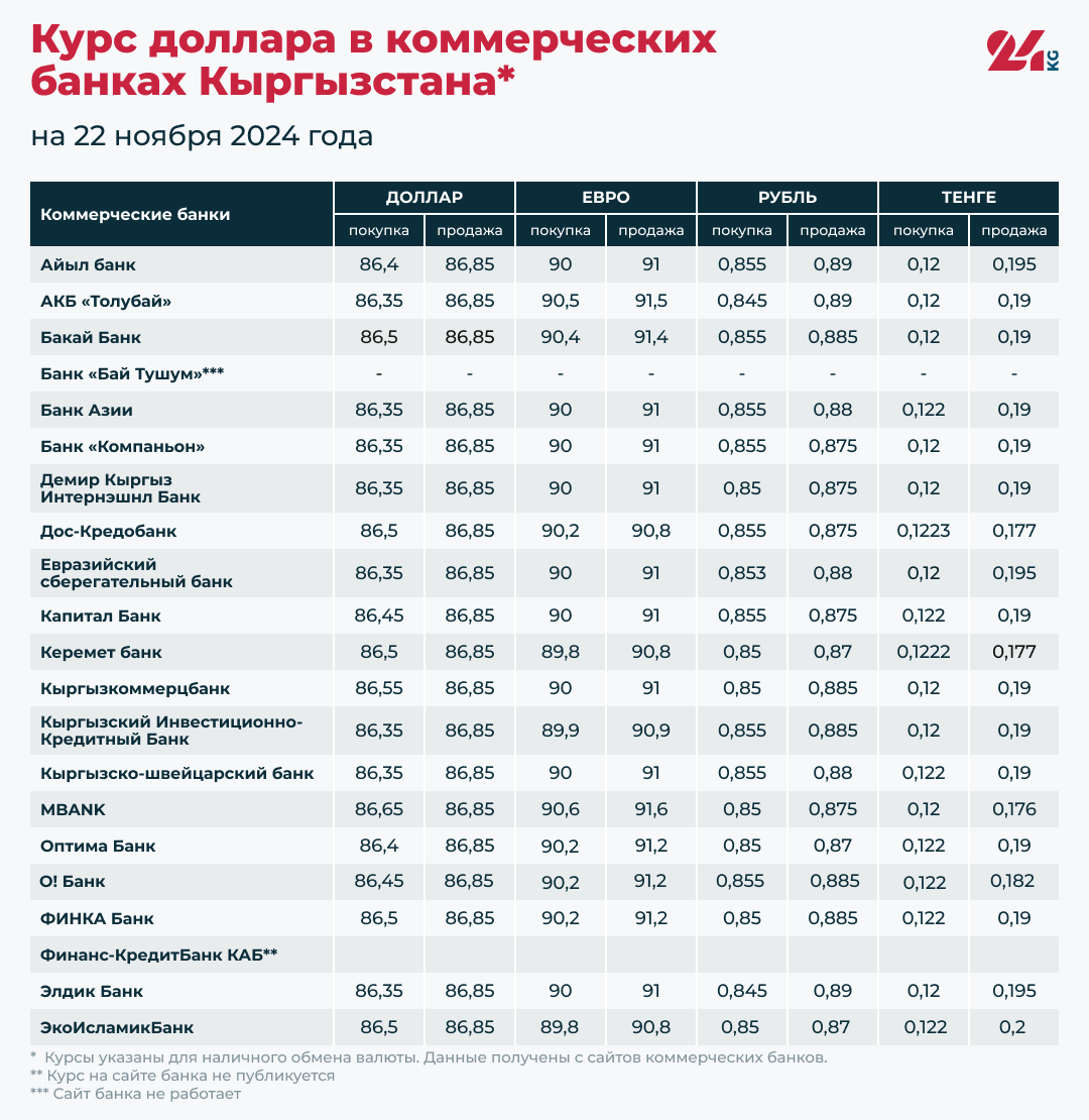 Курс доллара в коммерческих банках Кыргызстана на 22 ноября