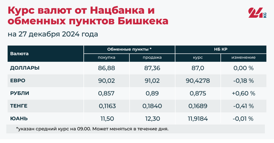 Евро подешевел относительно сома. Сегодня его покупают в среднем по 90,02 сома, продают по 91,02 сома. Официальный курс — 90,4278 сома (снижение — 0,18 процента).