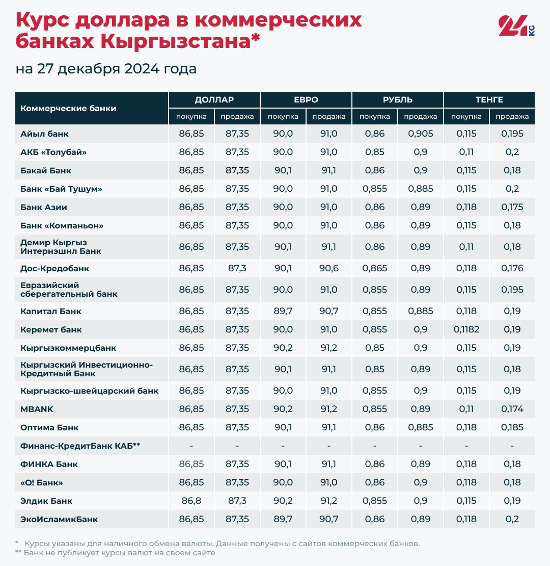 Курсы валют в коммерческих банках Кыргызстана на 27 декабря