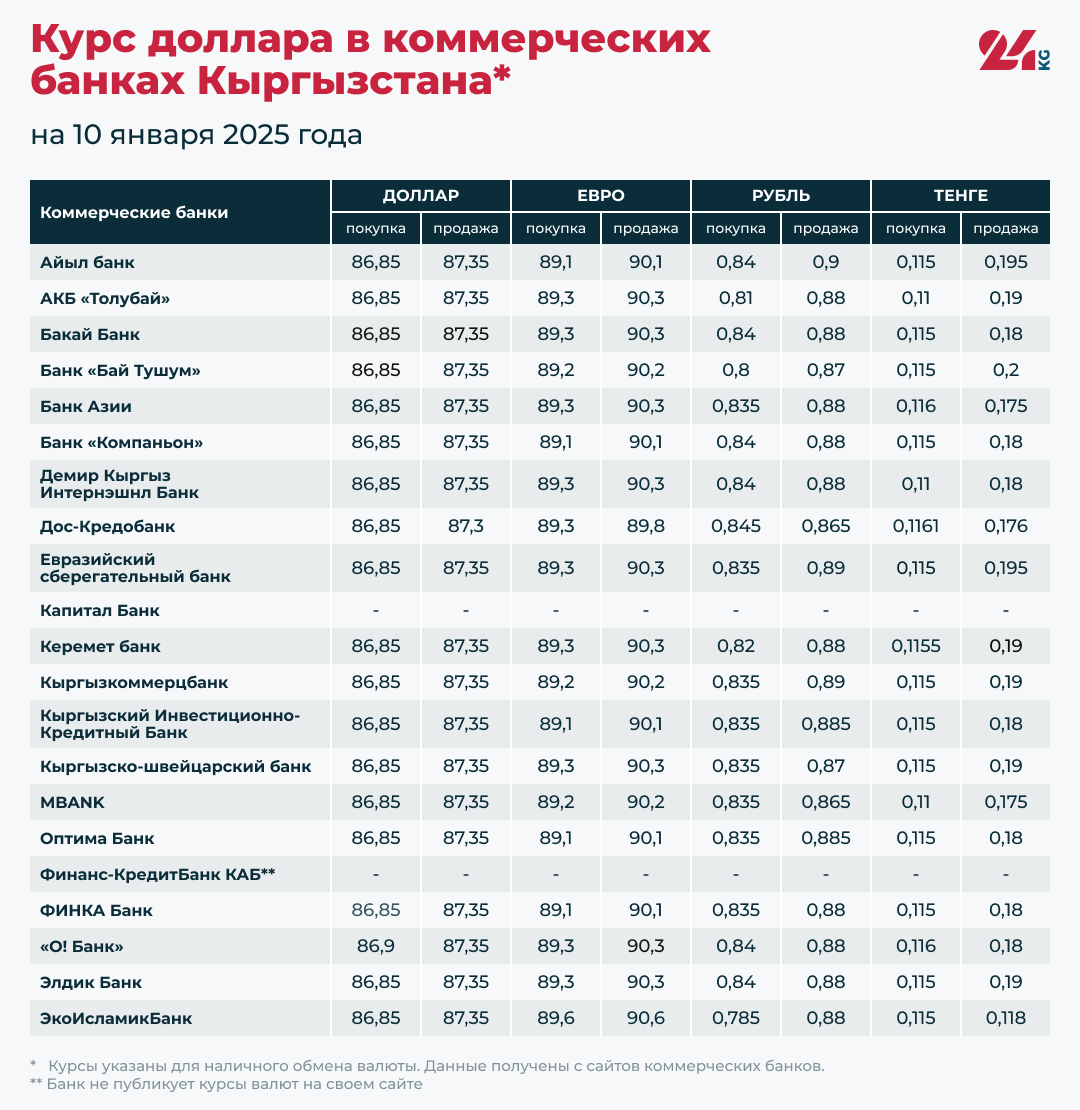 Курсы валют в коммерческих банках Кыргызстана на 10 января