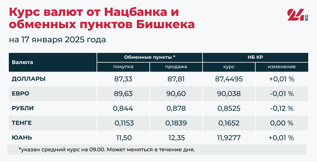 Сегодня с утра обменные пункты в столице покупают в среднем доллар по 87,33 сома, продают по 87,81 сома. Номинальный курс Нацбанка — 87,4495 сома (рост — 0,01 процента).