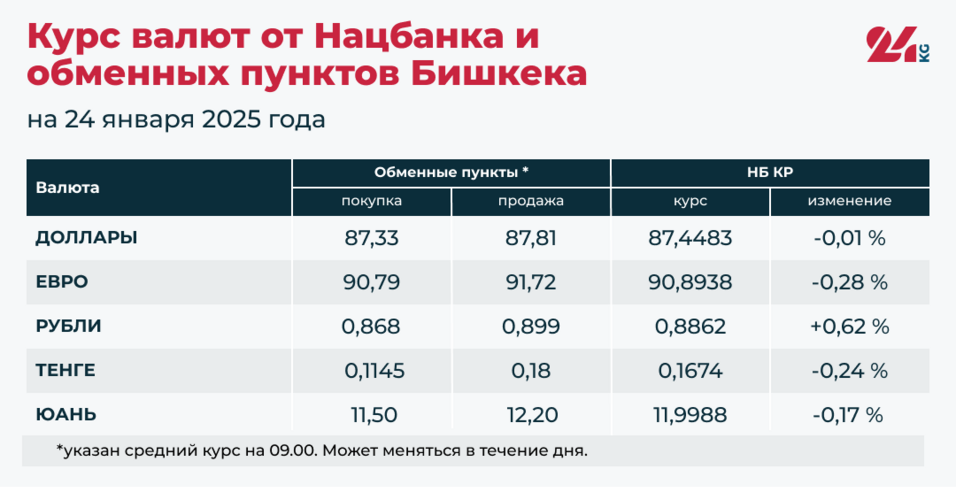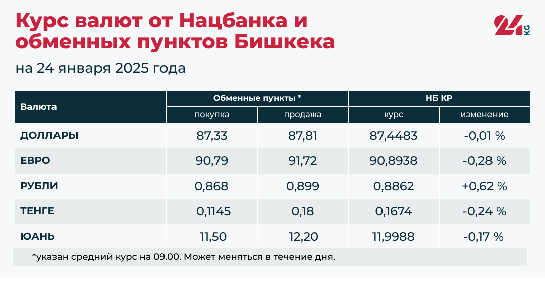 Сегодня с утра обменные пункты в столице покупают в среднем доллар по 87,33 сома, продают по 87,8 сома. Номинальный курс Нацбанка — 87,4483 сома (снижение — 0,01 процента).