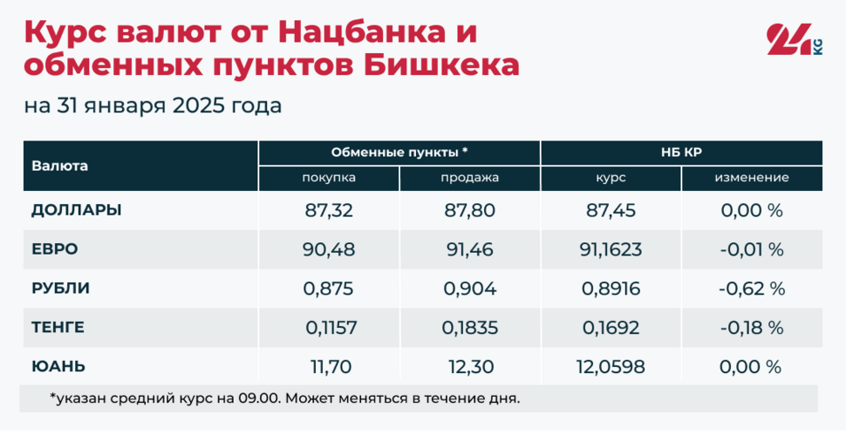 Сегодня с утра обменные пункты в столице покупают в среднем доллар по 87,32 сома, продают по 87,8 сома. Номинальный курс Нацбанка — 87,45 сома (без изменений).