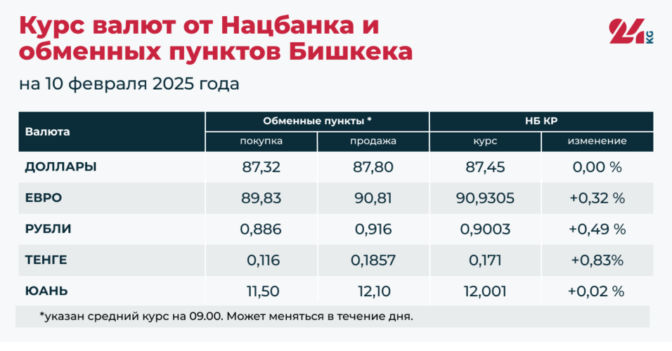 Российский рубль также подорожал. Сегодня в Бишкеке его покупают по 0,886 сома, продают по 0,916 сома. Курс НБ КР — 0,9003 сома (рост — 0,49 процента).