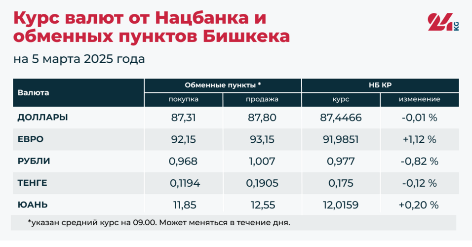 Курс доллара незначительно изменился. Сегодня с утра обменные пункты в столице покупают его в среднем по 87,31 сома, продают по 87,8 сома. Номинальный курс Нацбанка — 87,4466 сома (снижение — 0,01 процента).