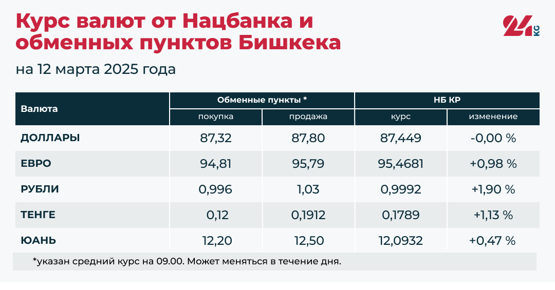 Китайский юань подорожал. В среднем его покупают по 12,2 сома, продают по 12,5 сома. Официальный курс — 12,0932 сома (рост — 0,47 процента).