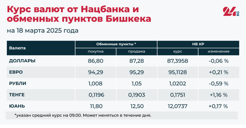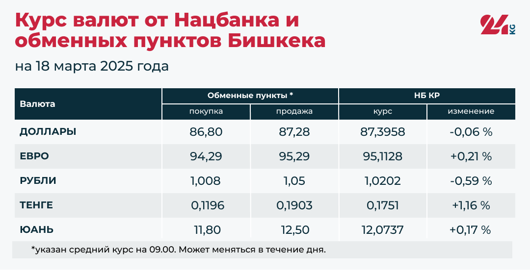 Официальные курсы евро и тенге повысились, доллара, российского рубля и юаня — снизились. Об этом свидетельствуют данные Национального банка Кыргызстана и обменных пунктов Бишкека.