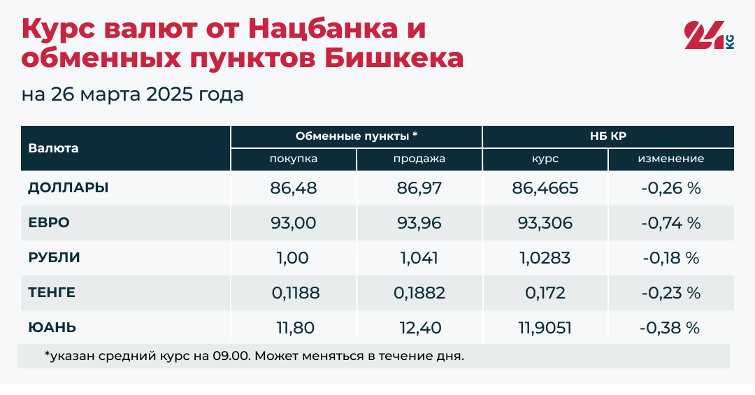 - Официальный курс Национального банка КР — 86,4665 сома (снижение — 0,26 процента).