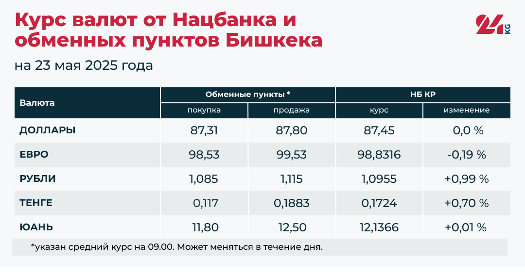 - Официальный курс Нацбанка — 98,8316 сома (снижение — 0,19 процента).
