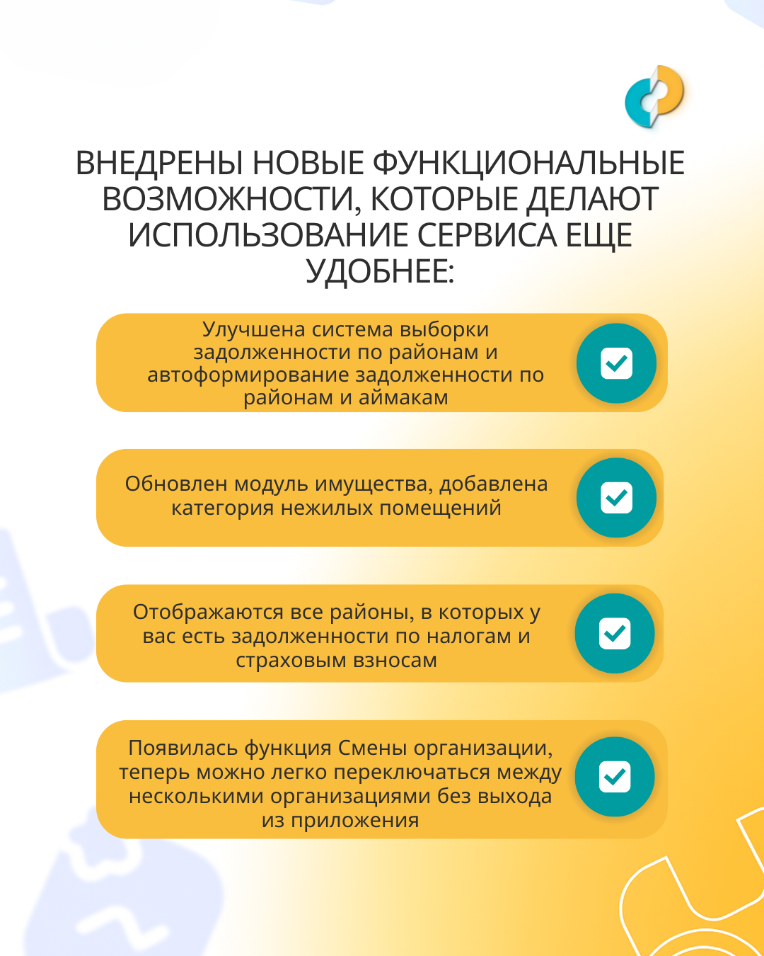 Улучшена система отображения задолженностей по районам и аймакам. В модуль имущества добавили категорию нежилых помещений. Приложение показывает все районы, где есть задолженности по налогам и страховым взносам.