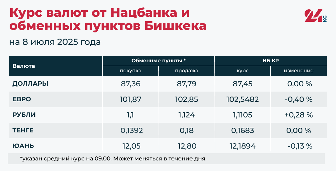 • Средний курс в обменных пунктах: покупка — 87,36 сома, продажа — 87,79 сома.