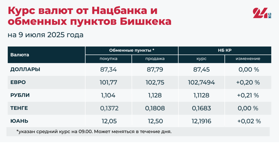 • Средний курс в обменных пунктах: покупка — 87,34 сома, продажа — 87,79 сома.