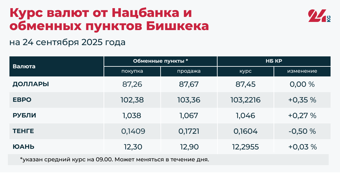 • Средний курс в обменных пунктах: покупка — 87,26 сома, продажа — 87,67 сома.