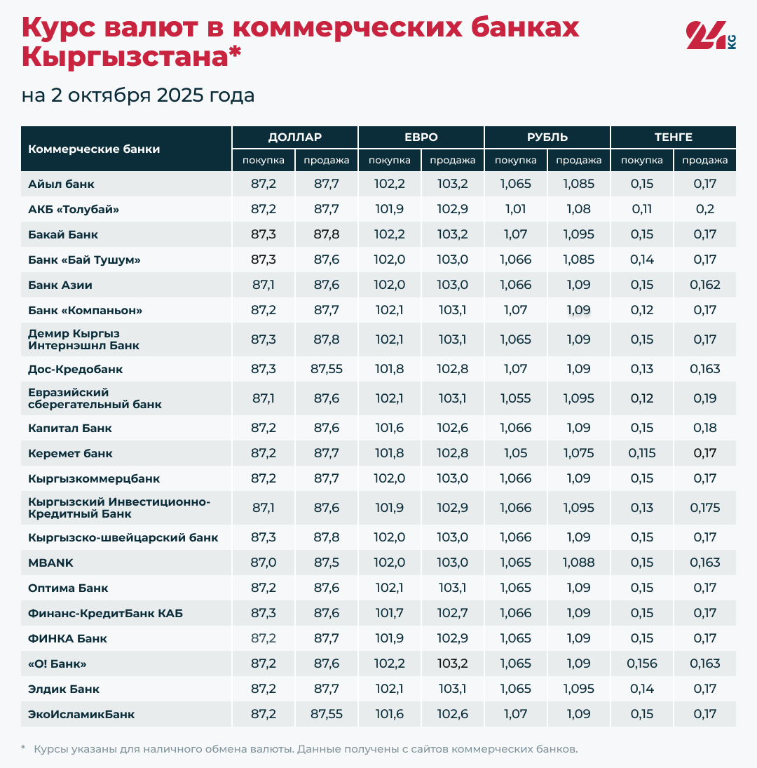Курс валют в коммерческих банках Кыргызстана на 2 октября
