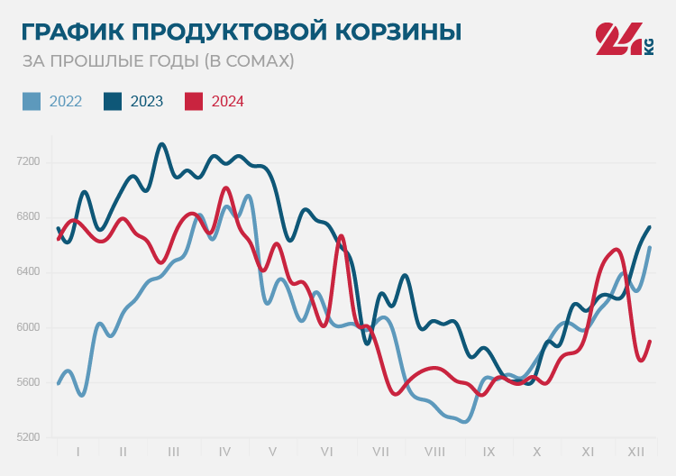 За 2024 год продуктовая корзина подешевела на 743 сома. Самая низкая ее стоимость отмечена 14 сентября — 5 тысяч 510 сомов. Самой дорогой корзина была 13 апреля — 7 тысяч 18 сомов.