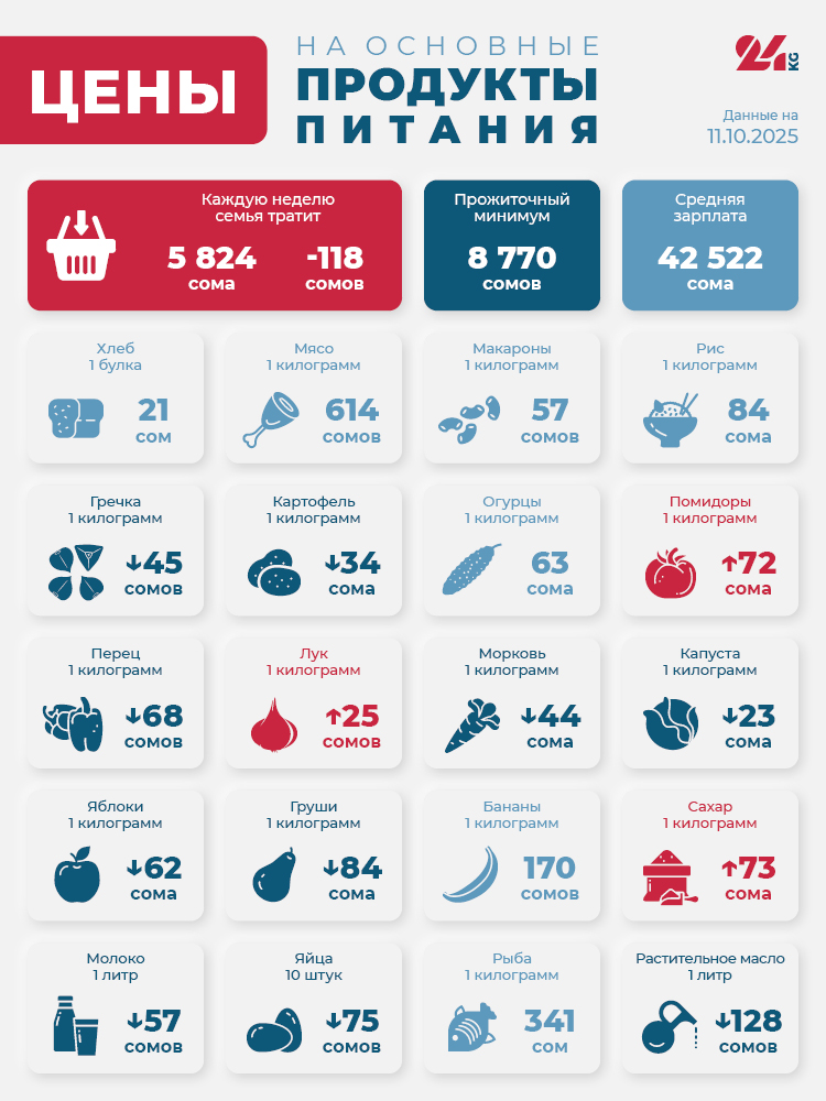Анализ показывает, что с начала нашего эксперимента в конце октября 2018 года стоимость продуктовой корзины выросла на 2 тысячи 554 сома. По сравнению с аналогичным периодом 2024-го она подорожала на 314 сомов, а с начала года подешевела на 243.