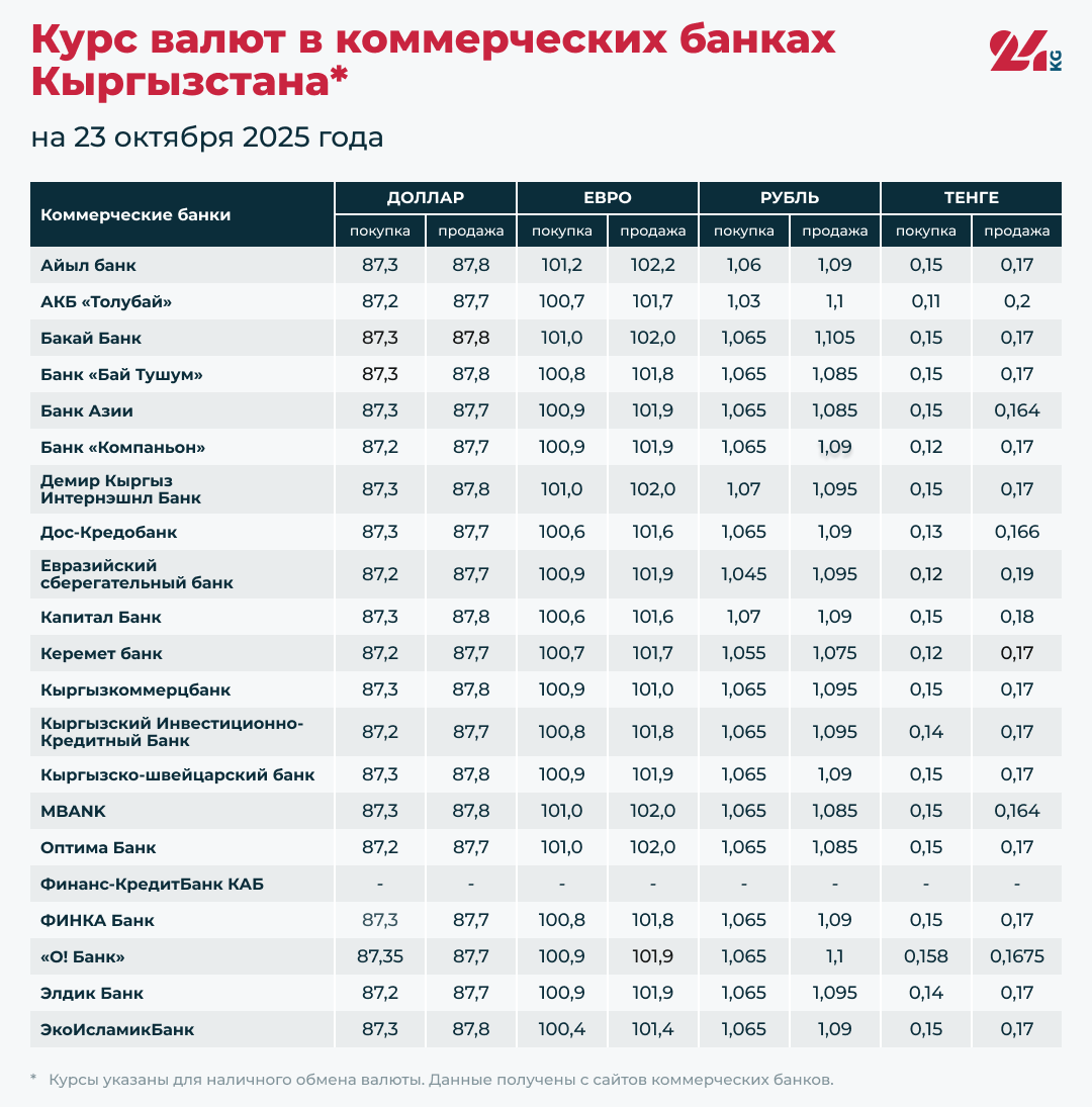 Информация актуальна на момент публикации. Курсы указаны для наличного обмена валюты. В течение дня курсы валюты могут меняться.Официальный курс Нацбанка КР и курсы валют в обменных пунктах Бишкека можно посмотреть здесь.